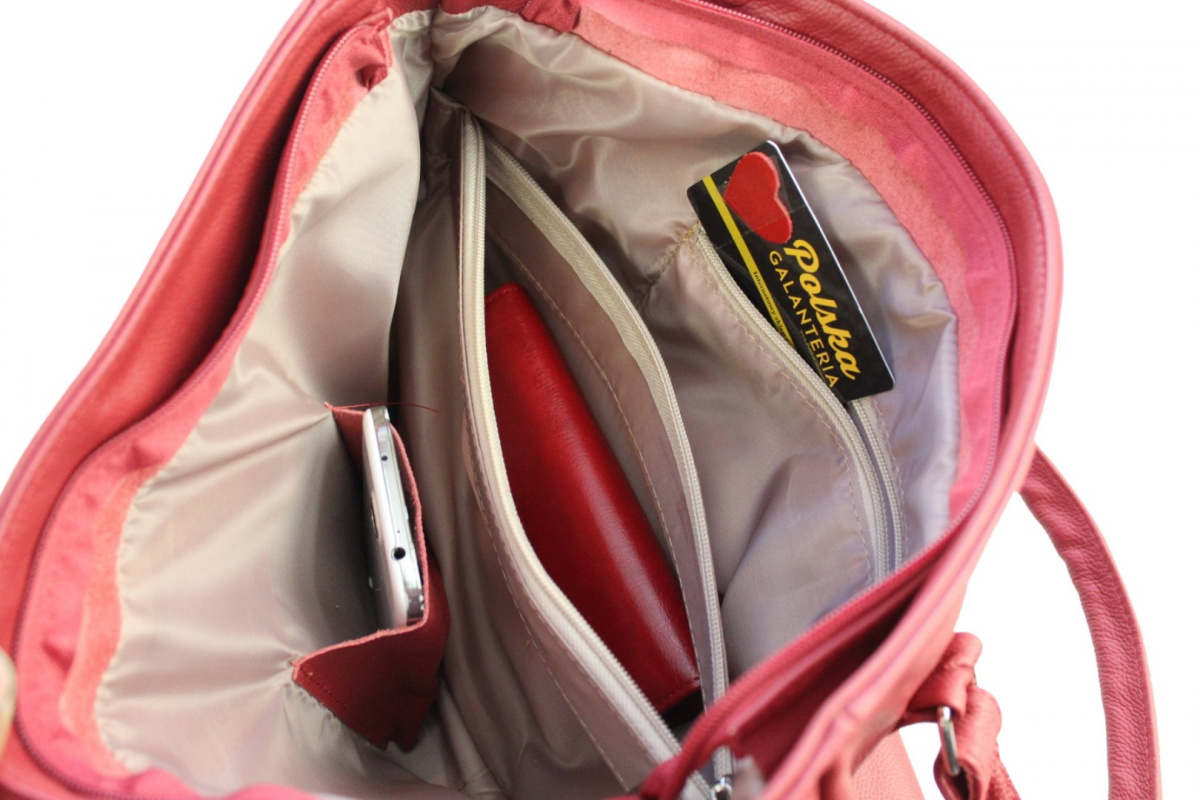 - Wewnątrz na bokach torebki znajduje się zapinana na suwak kieszonką na dokumenty oraz kieszonka na telefon komórkowy