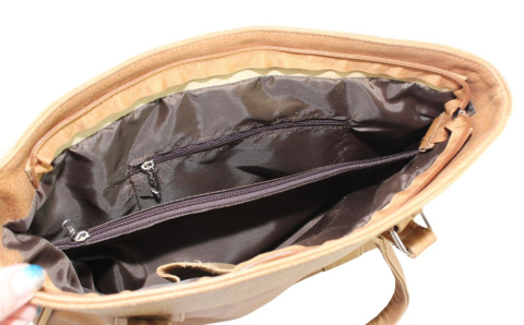 - Wewnątrz na bokach torebki znajduje się zapinana na suwak kieszonką na dokumenty oraz kieszonka na telefon komórkowy