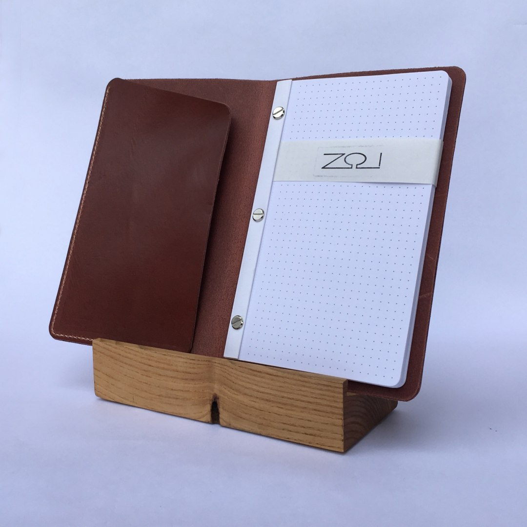 - Wewnątrz znajduje się wymienny wkład notatnika o wymiarach 20,5 x 12,5 [cm] mocowany za pomocą trzech śrubek (rozstaw co 8 cm)