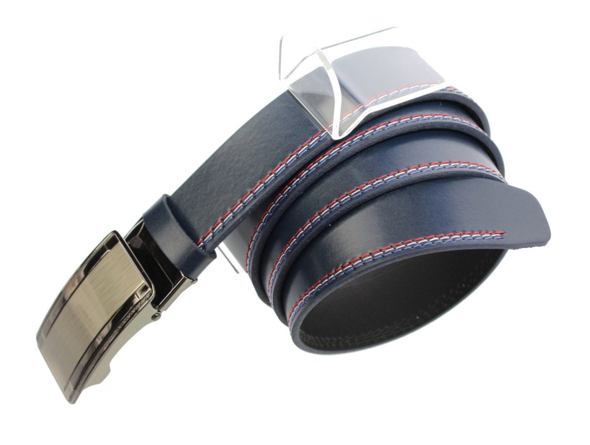 Pasek Skórzany Do Garnituru COMPLEX (PL) 35 mm AUTOMAT SAMOZACISK KLAMRA "SREBRNA 18" Skóra Naturalna Licowa GRANATOWY Z SZYCIEM