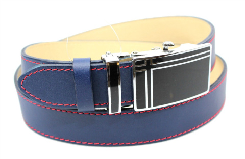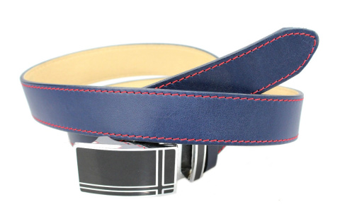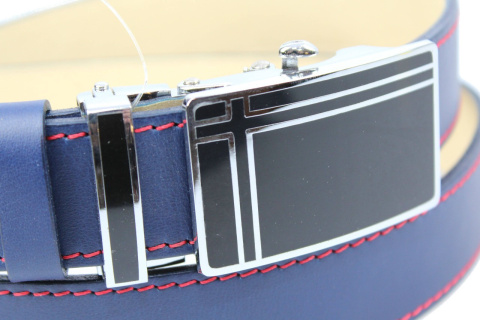 Pasek Skórzany Gładki PAS-MAX (PL) 35 mm AUTOMAT SAMOZACISK KLAMRA "CZARNA 14" Skóra Naturalna Licowa EXTRA GRANATOWY Z Czerwoną Nitką