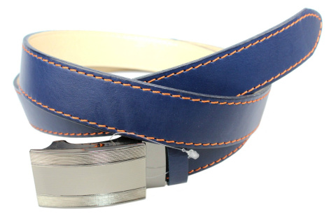 Pasek Skórzany Gładki PAS-MAX (PL) 35 mm AUTOMAT SAMOZACISK ŁAMANY KLAMRA "SREBRNA 5" Skóra Naturalna Licowa EXTRA GRANATOWY Z Pomarańczową Nitką