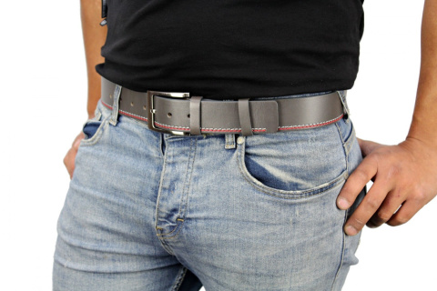Pasek Skórzany PAS-MAX (PL) Skóra Naturalna Licowa EXTRA 40 mm Beżowo-Grafitowy Z Czerwoną I Białą Nitką