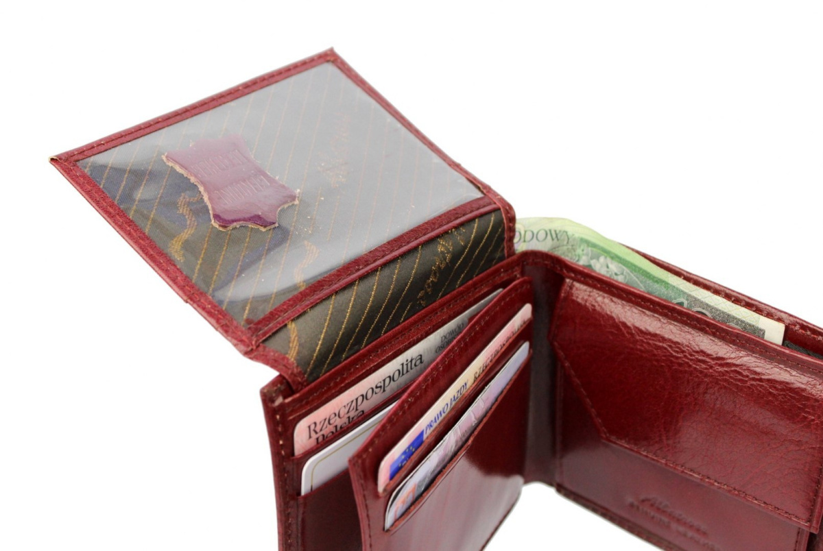 - Portfel w swoim wnętrzu posiada jedno skrzydełko do góry na którym znajdują się miejsca na 2 karty formatu ID i jedno przezroczyste o wymiarach 7 x 9 [cm]