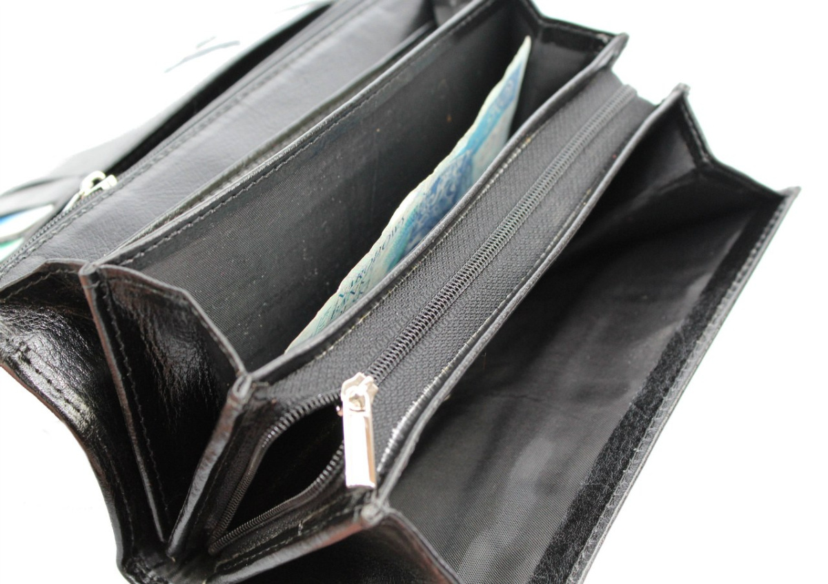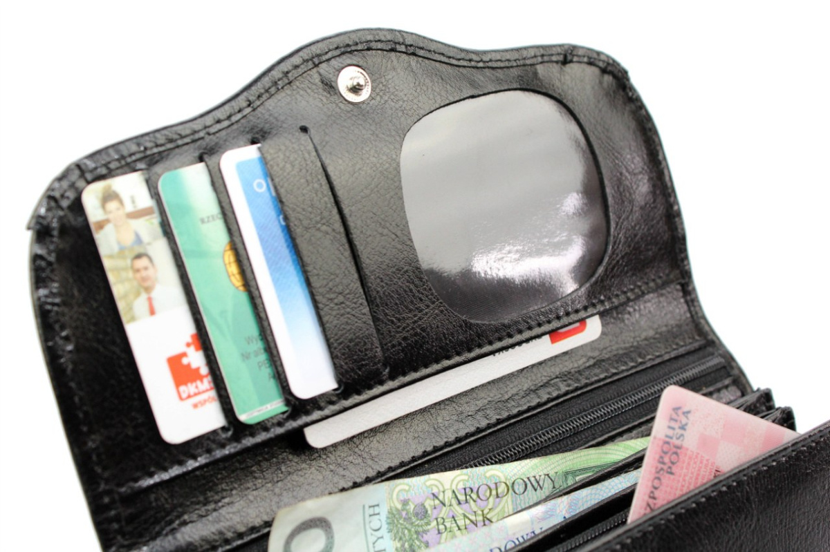 - Wewnątrz portfela, na przedniej części znajduje się dodatkowa kieszeń z wydzieloną skrytką na zamek