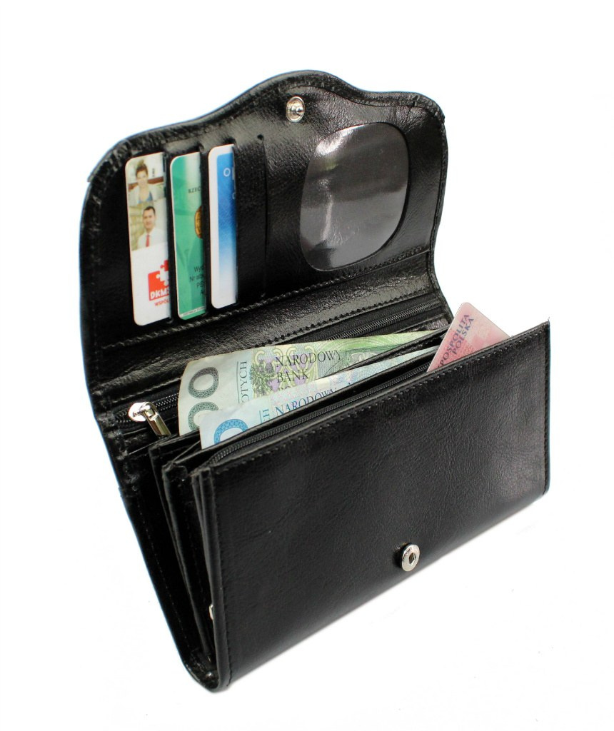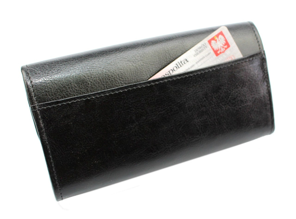 - Dodatkowe 4 kieszenie na dokumenty formatu ID oraz kieszeń na fotografie 6,5 x 4,5 [cm] znajdują się wewnętrznej części klapki portfela