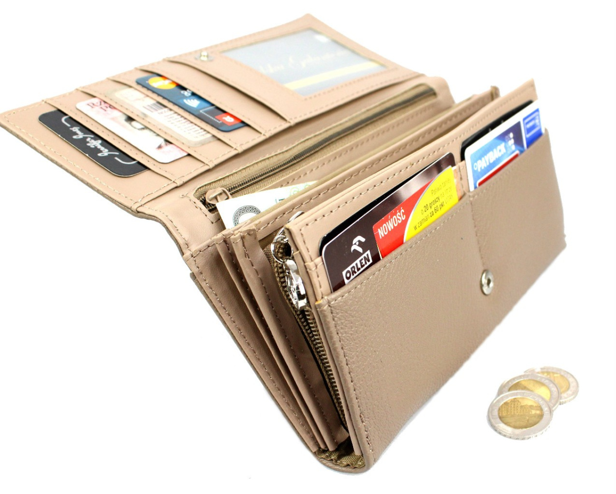 Modny damski portfel wykonany z najwyższej jakości eko-skóry. Jego rozmiary są dobrane w taki sposób, aby można było swobodnie ulokować zarówno banknoty jak i powszechnie używane dokumenty. Całość prezentuje się niezwykle ładnie i estetycznie.