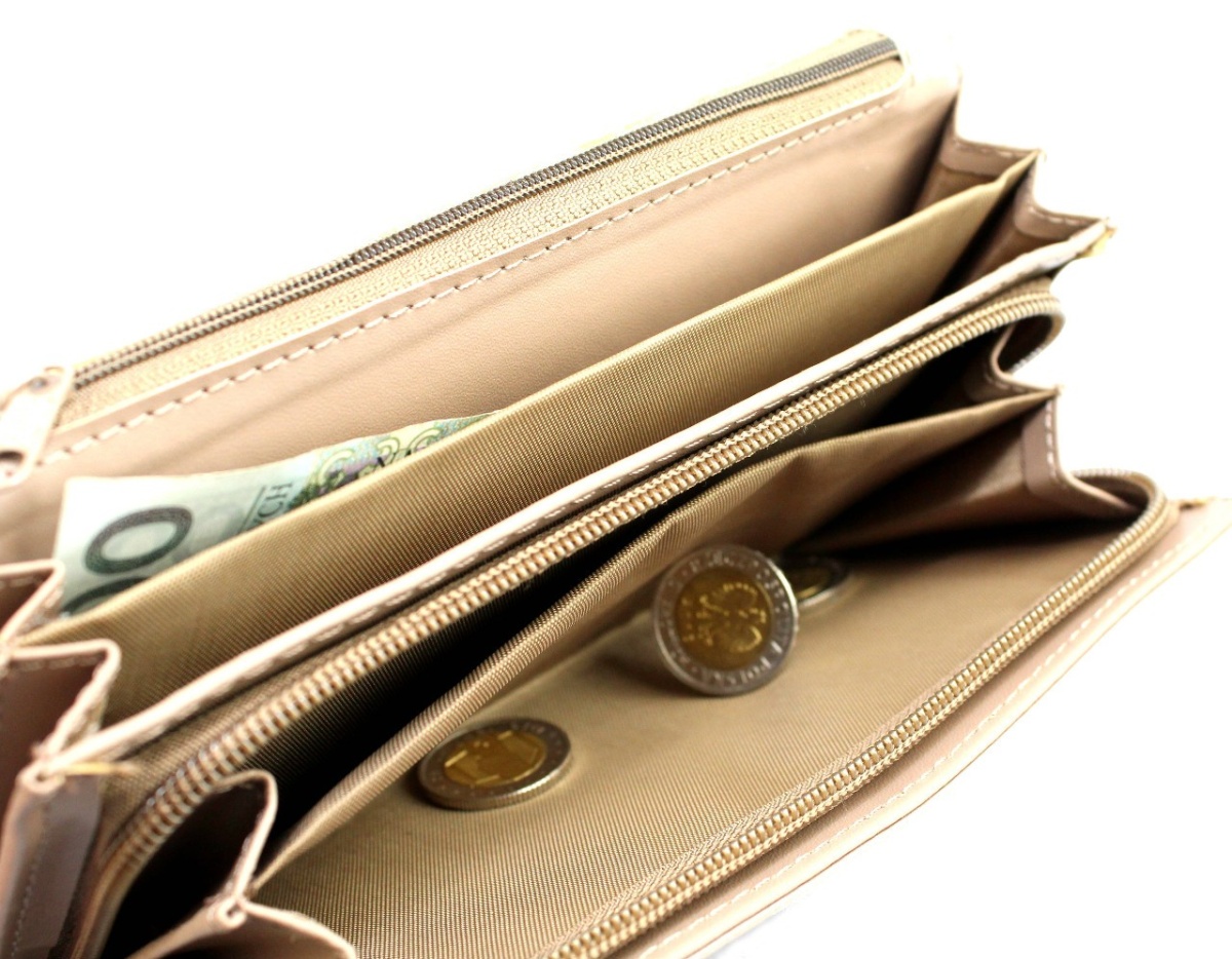 - Wewnętrzna część na monety podzielona jest na dwie części, zamykana na suwak,