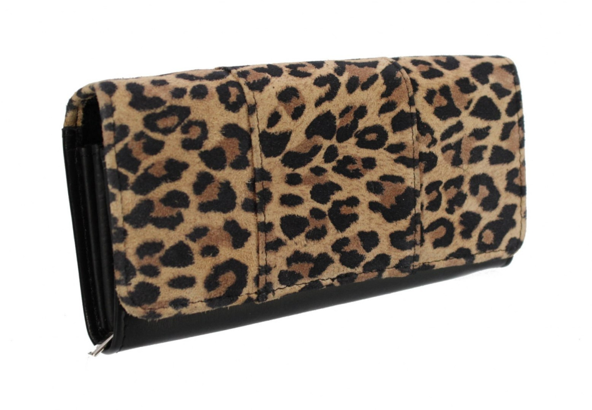 Stylowy portfel damski firmy PolskaGalanteria. Uszyty ze skóry naturalnej cielęcej, zapinany na solidną napę, ma wewnątrz funkcjonalnie rozmieszczone schowki, mieszczące nie tylko pieniądze, ale i ważne dokumenty, które zawsze warto mieć przy sobie. Przegródki otwarte oraz zamykane na suwak, a także dodatkowa kieszeń zapinana napą to część przeznaczona na banknoty i różne drobne przedmioty. W portfelu znajduje się także pięć miejsc na dokumenty w małym formacie, takie jak dowód osobisty, prawo jazdy czy karta miejska lub płatnicza. Przezroczysty schowek jest natomiast odpowiedni na fotografie czy wizytówki. Portfel ma także wszytą dodatkową kieszeń na zamek błyskawiczny. Bardzo istotnym elementem, jaki posiada ten model, jest zabezpieczenie RFID, które chroni karty i dokumenty przed przypadkowym zeskanowaniem przez złodzieja. Czarny portfel ma klapkę z teksturą w lamparcie cętki, wzorem lubianym przez wiele kobiet. Wymiary zewnętrzne portfela to: 17 x 9 x 3,5 cm.