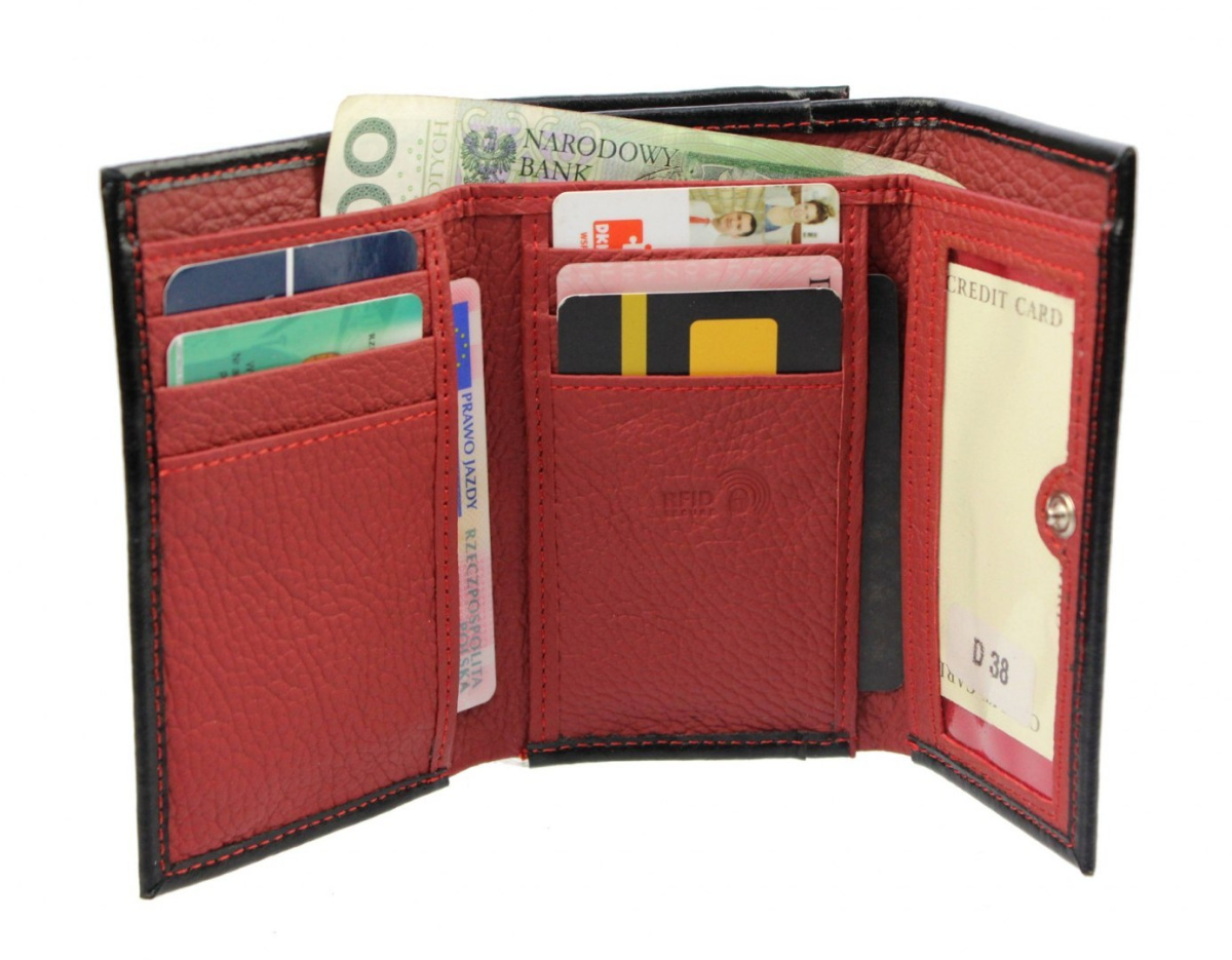 Portfel Damski PolskaGalanteria Z Wstawką 13 cm Suwak Skóra Naturalna CZARNY Z CZERWONYM KP D38-WST