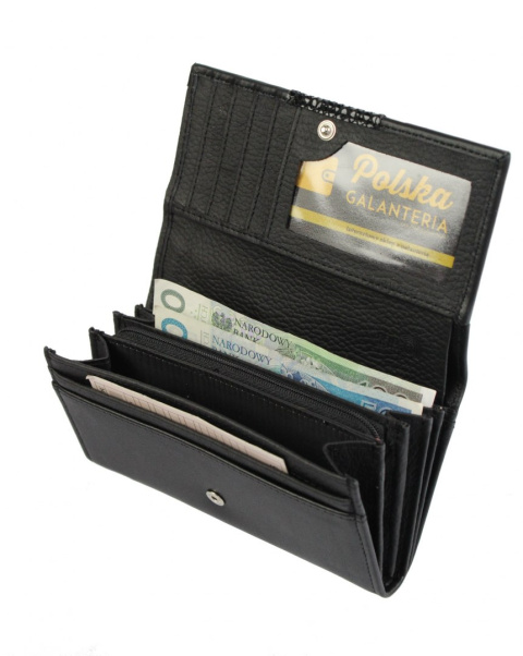 Wysokogatunkowa skóra naturalna, staranne wykończenie i klasyczny design - tak najprościej można opisać portfel marki PolskaGalanteria. Jednak walory estetyczne i jakościowe to nie wszystko, ponieważ prezentowany model cechuje także niebywała funkcjonalność. Produkt, pomimo niewielkich rozmiarów, bez problemu pomieści wszystkie niezbędne dokumenty i świetnie leży w drobnej, kobiecej dłoni. Ogromnym atutem prezentowanego modelu jest duża ilość praktycznych kieszeni, które umożliwiają uporządkowanie przechowywanej zawartości. Obok standardowych przegródek na banknoty i zamykanej na suwak kieszeni na bilon znalazło się również sporo miejsca na wszystkie dokumenty, karty, wizytówki i fotografie.