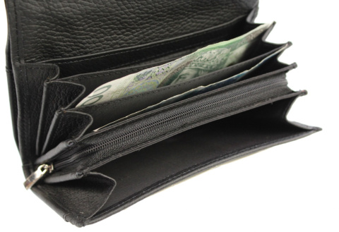 - Z przodu portfela przed kieszeniami roboczymi dodatkowe 2 kieszenie na większe dokumenty.