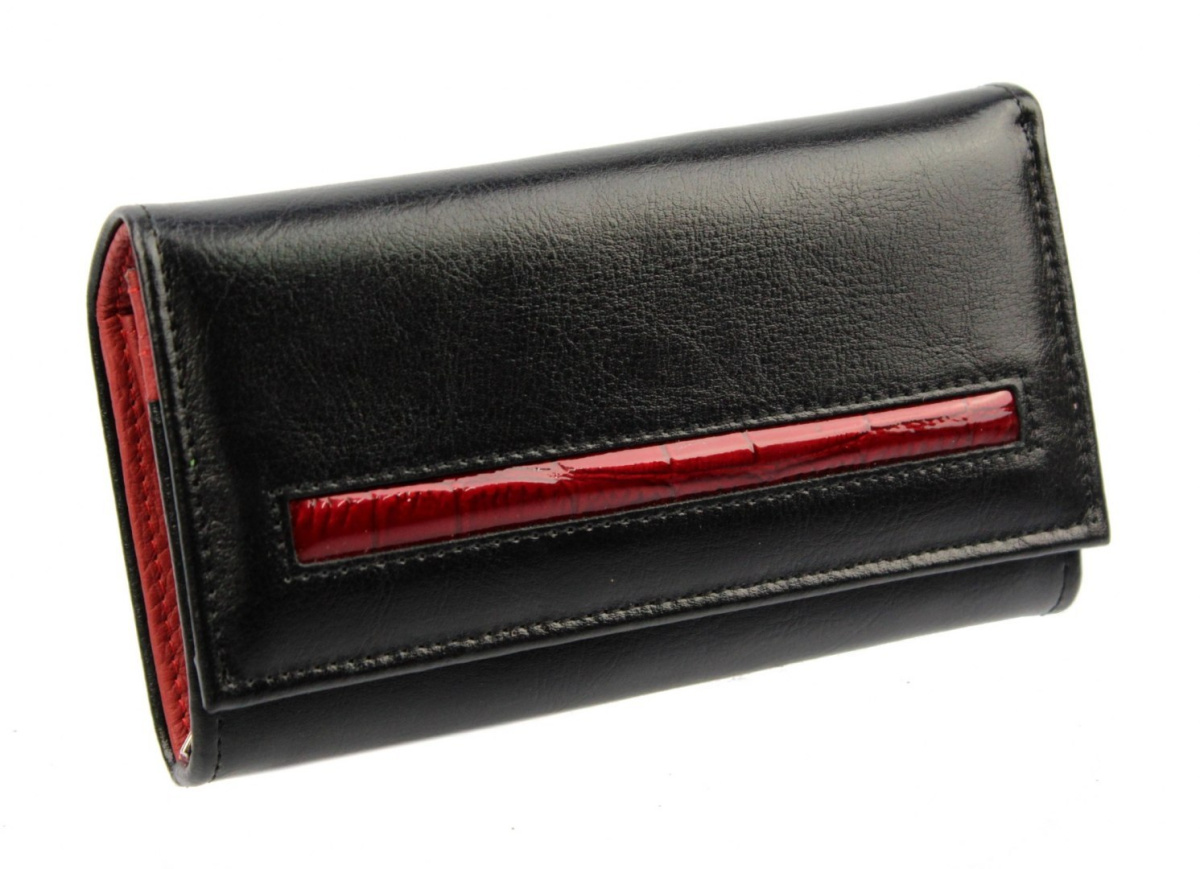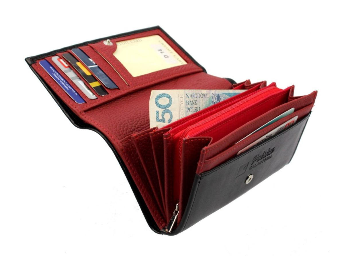 Portfel Damski PolskaGalanteria Z Wstawką Długi Suwak Skóra Naturalna CZARNY Z CZERWONYM Wzór I D14-WST