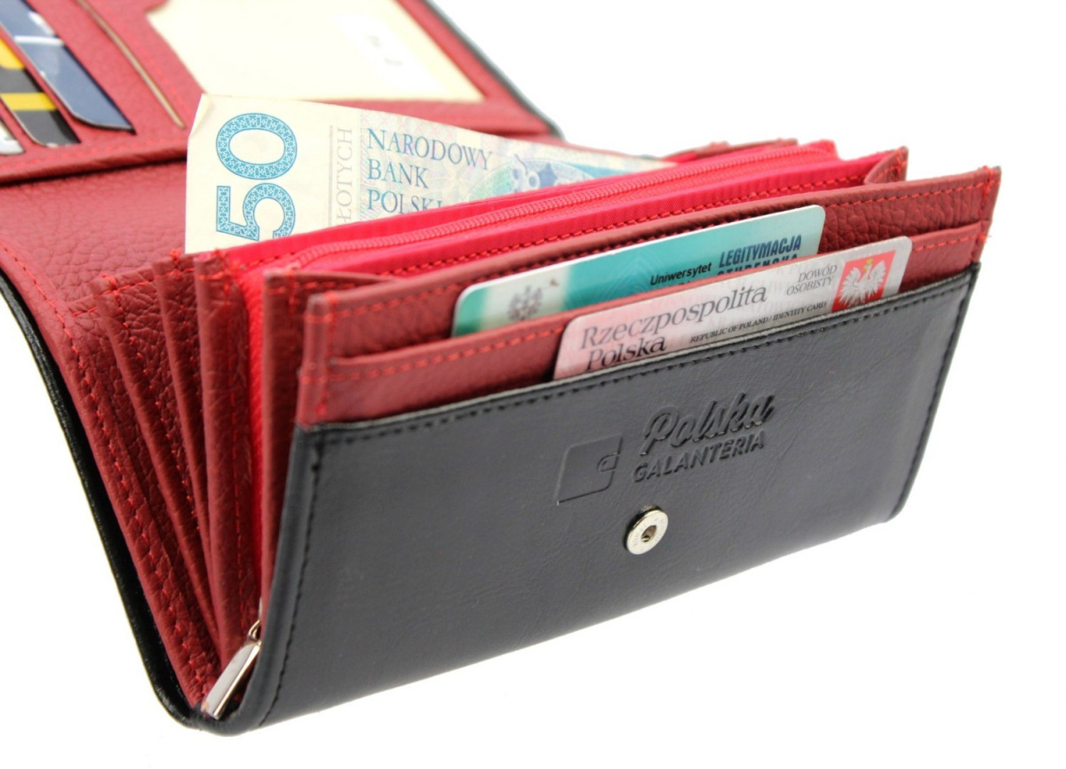 - Z przodu portfela przed kieszeniami roboczymi dodatkowe 2 kieszenie na większe dokumenty.