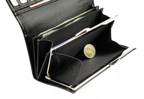 z poręcznym ładnym uchwytem, - Kieszeń na monety jest wykonana w taki sposób, że nie ma prześwitów w dolnych rogach - co zapobiega gubieniu zawartości; kieszeń odchyla się na tyle daleko, że nie ma problemów z wyciąganiem bilonu; zawartość jest doskonale widoczna,