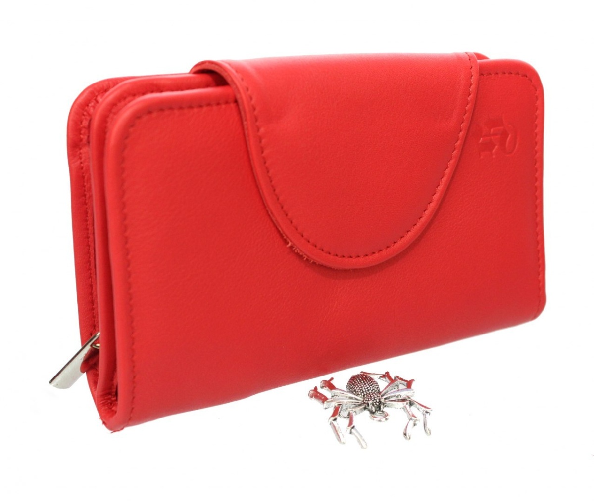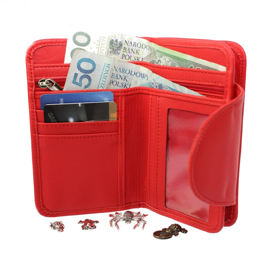 Zgrabny portfel damski SARA w czerwonym kolorze, który według feng shui przywołuje pieniądze, wykonany jest z naturalnej skóry cielęcej, miękkiej i ciepłej w dotyku. Dzięki niewielkim wymiarom 14x9,5 cm portfel wygodnie leży w dłoni i zmieści się nawet w małej damskiej torebce. Mimo że jest nieduży, mieszczą się w nim zarówno banknoty, bilon, jak i potrzebne dokumenty. Część na monety zapinana jest na suwak i nie ma prześwitów w dolnych rogach, co zapobiega gubieniu zawartości. Część na banknoty to dwie głębokie kieszenie, a część na dokumenty ma pięć przegródek formatu ID oraz kieszeń na fotografie. Zapinane razem na solidny nap. Pomiędzy nimi ulokowany jest praktyczny schowek zapinany na suwak.