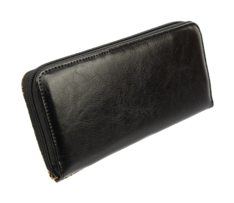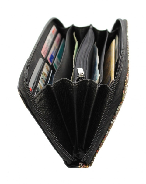 Duży, bardzo wygodny i pojemny portfel damski został wyprodukowany ze skóry licowej z dbałością o najmniejszy szczegół. Podszewka to wysokiej jakości materiał w modne wzory. Całość zapinana jest na metalowy zamek z elegancką końcówką. W środku znajdują się cztery kieszenie na banknoty, które zostały przedzielone kieszenią z przeznaczeniem na bilon, zapinaną na suwak, której rogi są specjalnie wzmocnione, aby nic z niej nie wypadało. Od wewnątrz na ściankach znajduje się dwanaście kieszeni na dokumenty, karty kredytowe czy wizytówki. Wymiary portfela to 20x10,5x2,5 cm, a jego układ jest poziomy.