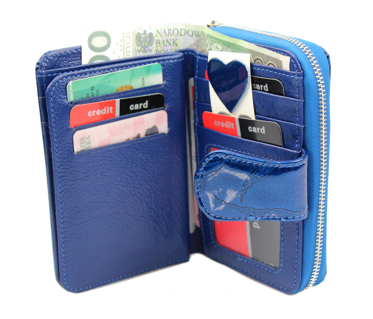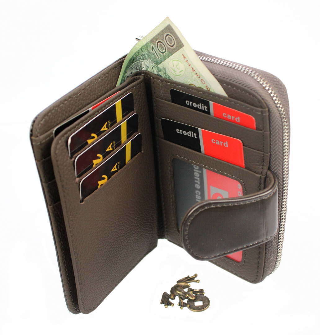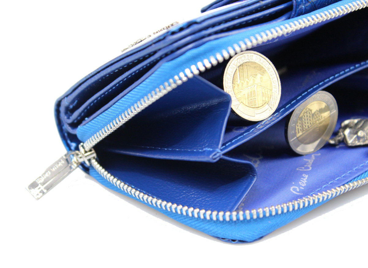 - Duża, dzielona kieszeń na bilon / monety zasuwana na metalowy suwak wysokiej jakości i wytrzymałości
