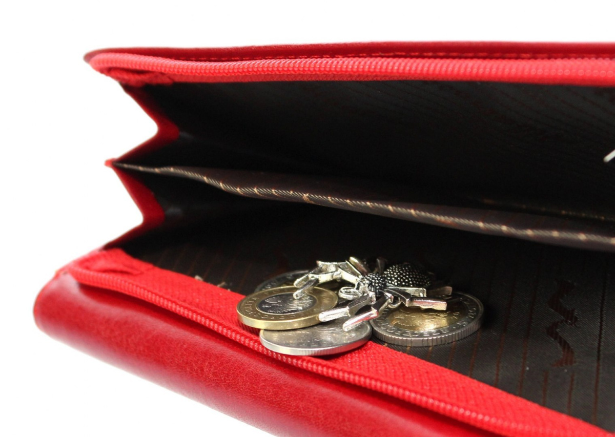 - Na zewnętrznej części portfela znajduje się duża zapinana na solidny suwak podwójna kieszeń na bilon.