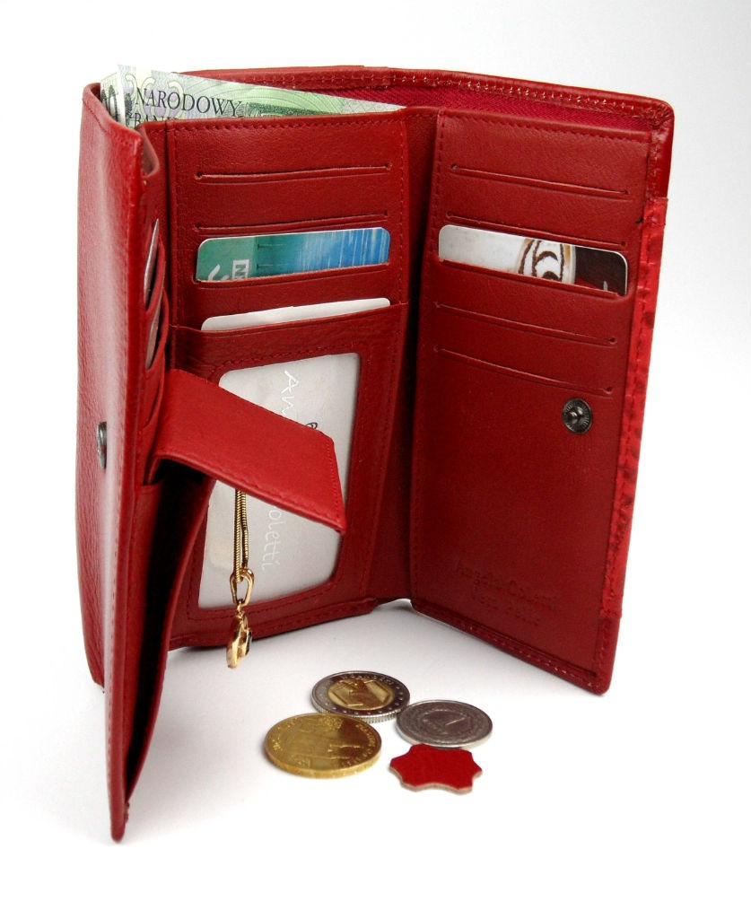 - Wewnątrz znajduje się kieszeń na banknoty z dodatkową skrytką zapinaną zamkiem błyskawicznym