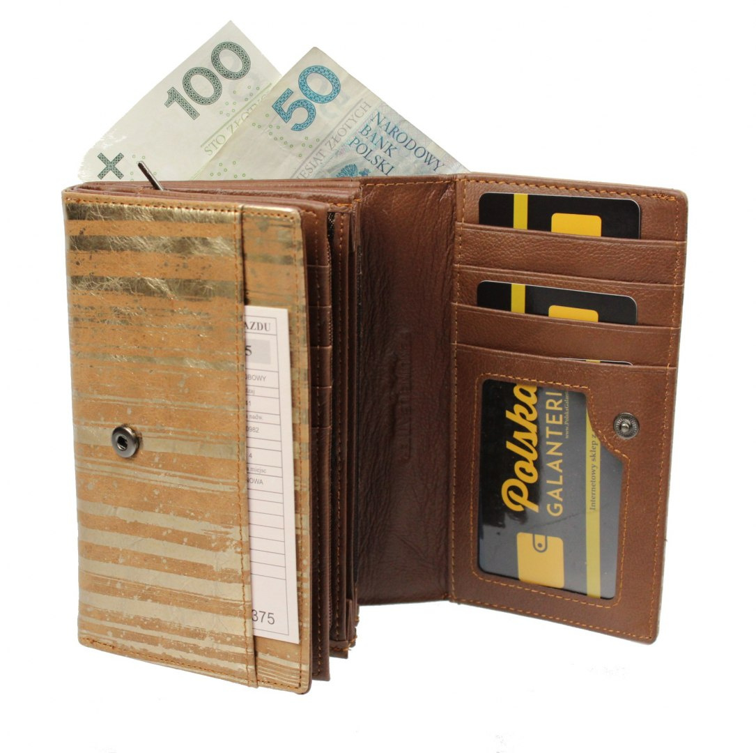 - Z boku portfela, od szczytu pojemna kieszeń na banknoty lub większe dokumenty