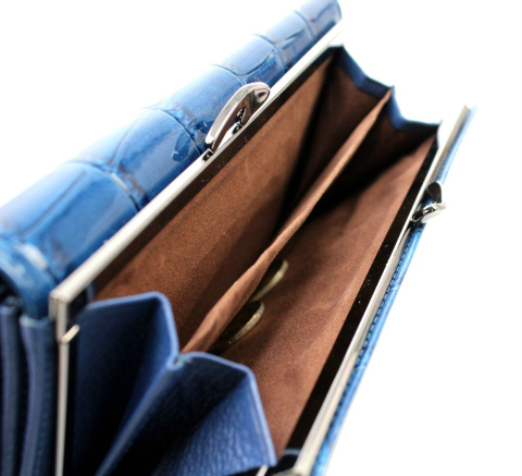 - Na zewnętrznej części portfela znajduje się duża zapinana na metalowy zatrzask podwójna kieszeń na bilon