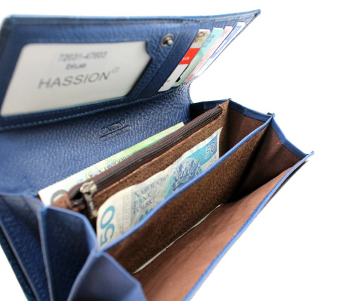 - Portfel jest zamykany klapką z napem na której znajduje się ozdobna blaszka z logo producenta.