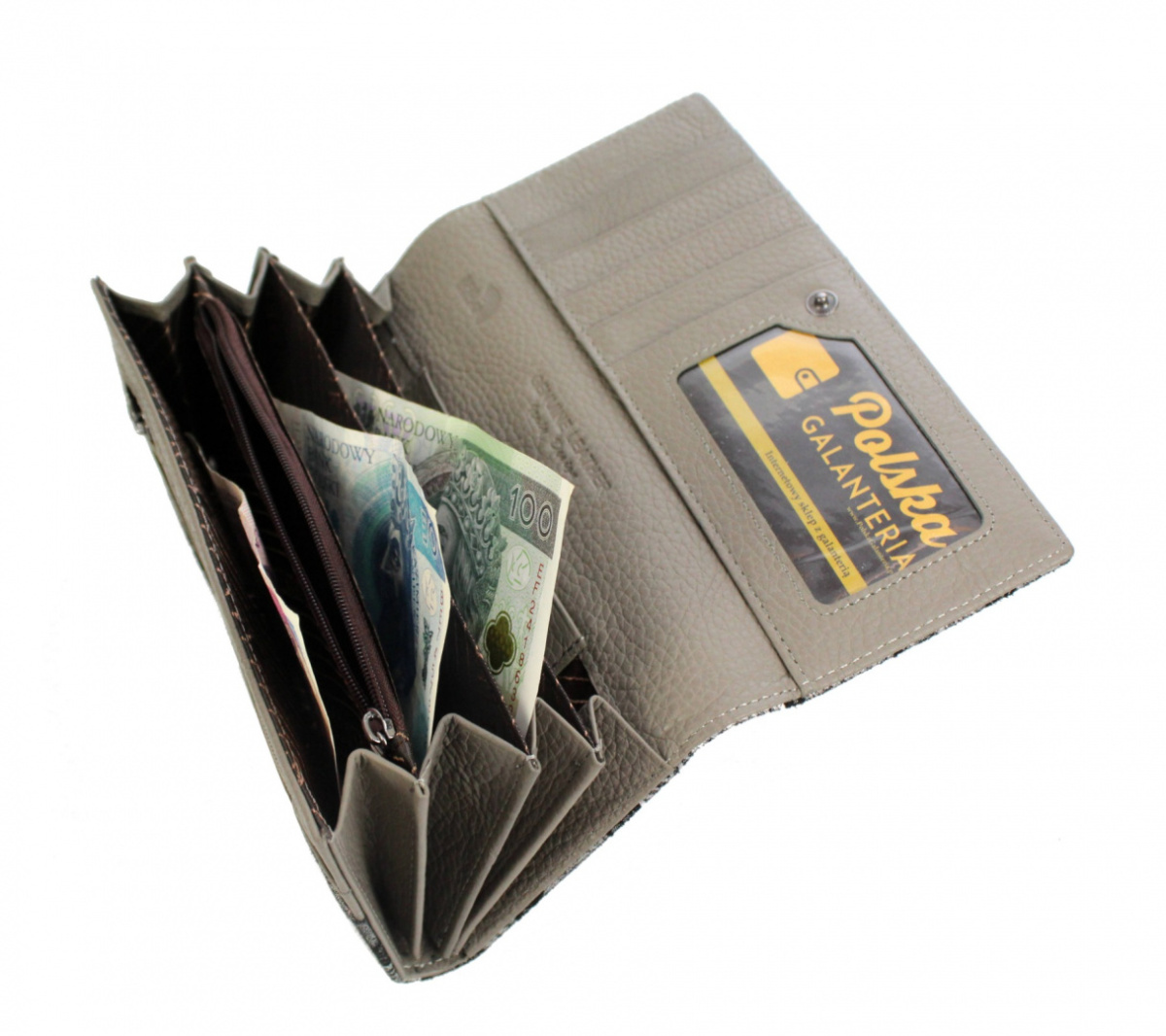 Model ten jest jednym z najlepszych i najczęściej używanych portfeli damskich. Jego rozmiary są dobrane w taki sposób, aby można było swobodnie ulokować zarówno banknoty jak i powszechnie używane dokumenty. Całość prezentuje się niezwykle ładnie i estetycznie.
