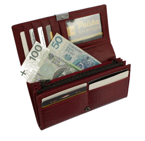 Model ten jest jednym z najlepszych i najczęściej używanych portfeli damskich. Jego rozmiary są dobrane w taki sposób, aby można było swobodnie ulokować zarówno banknoty jak i powszechnie używane dokumenty. Całość prezentuje się niezwykle ładnie i estetycznie.