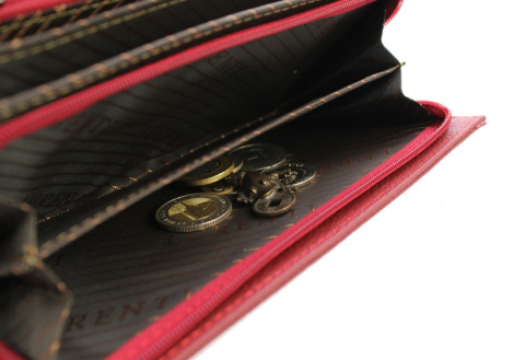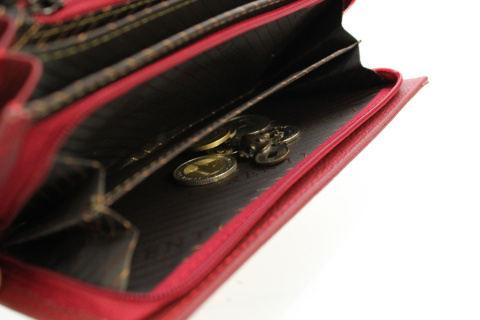 - Wewnątrz portfela znajduje się duża zapinana na solidny suwak podwójna kieszeń na bilon.