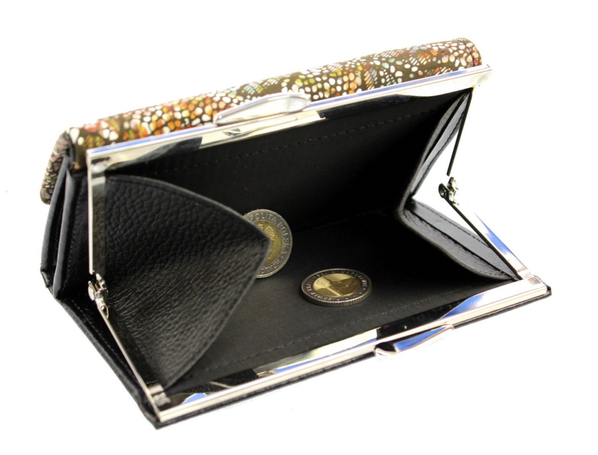 Portfel damski skórzany marki Polska Galanteria oferowany w naszym sklepie to elegancki i stylowy dodatek, który powinien znaleźć zastosowanie w każdej damskiej torebce. Pozwala on nie tylko na przechowywanie w jego wnętrzu pieniędzy, ale także jest w stanie pomieścić niezbędne dokumenty oraz karty kredytowe, które można w nim ulokować w dedykowanych do tego miejscach. Portfel ten zamykany jest za pomocą klapy z napą, pod którą została schowana obszerna kieszeń na banknoty, a także kieszeń na monety, zamykana za pomocą klamry. Portfel damski skórzany został wykonany w całości z naturalnej wysokogatunkowej skóry cielęcej. To, co go wyróżnia na tle innych portfeli z naszej oferty, to niezwykle stylowy print ulokowany na zewnętrznej stronie klapy.