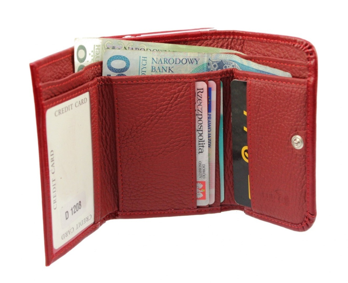 Damski portfel o wymiarach 12 x 9 centymetrów, wykonany z całkowicie naturalnej skóry. Składa się dwóch części, zewnętrznej i wewnętrznej. Pierwsza z nich zamykana na solidną klamrę przeznaczona jest na monety. Dzięki braku prześwitów w dolnych partiach, pieniądze nie wysypują się i nie gubią. Druga część wyposażona jest w wiele wygodnych przegródek i kieszonek takich jak podwójna kieszeń na banknoty, pięć kieszeni na dokumenty o formacie ID, kieszeń na fotografie rodziny i przyjaciół. Dużą zaletą tego modelu jest dodatkowe zabezpieczenie RFID, który zapobiega zeskanowaniu kart płatniczych. Portfel dostępny jest w dwóch klasycznych kolorach - czarnym i czerwonym, które nigdy nie wyjdą z mody.