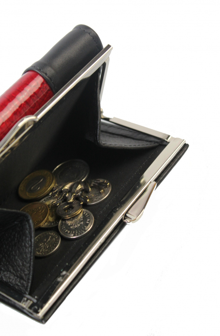 Damski portfel o wymiarach 12 x 9 centymetrów, wykonany z całkowicie naturalnej skóry. Składa się dwóch części, zewnętrznej i wewnętrznej. Pierwsza z nich zamykana na solidną klamrę przeznaczona jest na monety. Dzięki braku prześwitów w dolnych partiach, pieniądze nie wysypują się i nie gubią. Druga część wyposażona jest w wiele wygodnych przegródek i kieszonek takich jak podwójna kieszeń na banknoty, pięć kieszeni na dokumenty o formacie ID, kieszeń na fotografie rodziny i przyjaciół. Dużą zaletą tego modelu jest dodatkowe zabezpieczenie RFID, który zapobiega zeskanowaniu kart płatniczych. Portfel dostępny jest w dwóch klasycznych kolorach - czarnym i czerwonym, które nigdy nie wyjdą z mody.