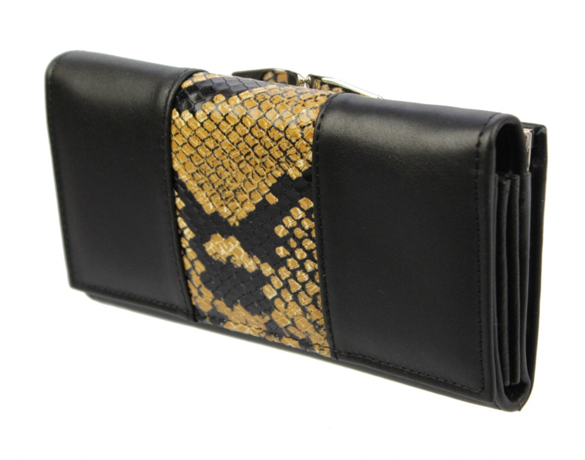 Portfel Damski Skórzany PolskaGalanteria Z Wstawką Długi Z Klamrą Na Zewnątrz CZARNY Wzór II D1601-WST