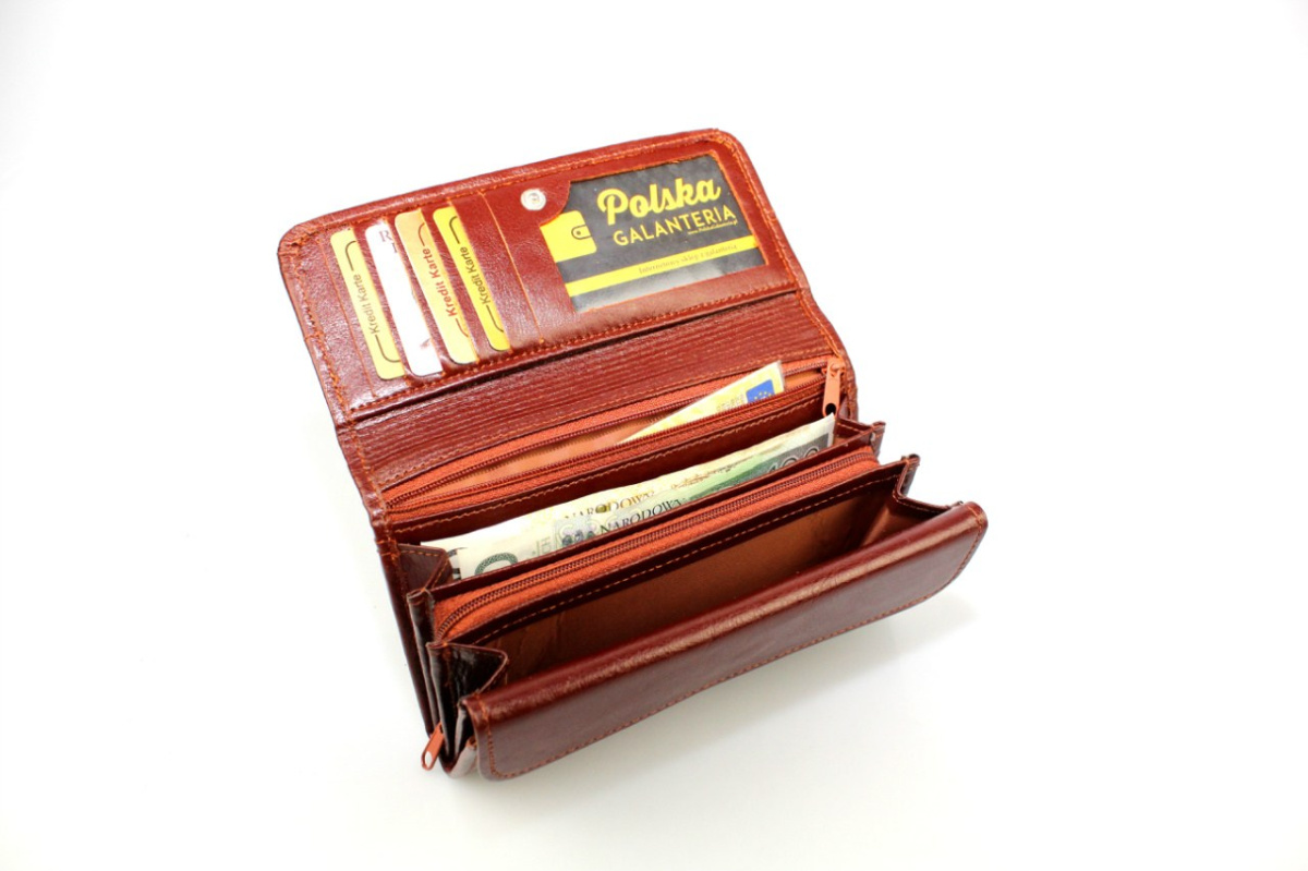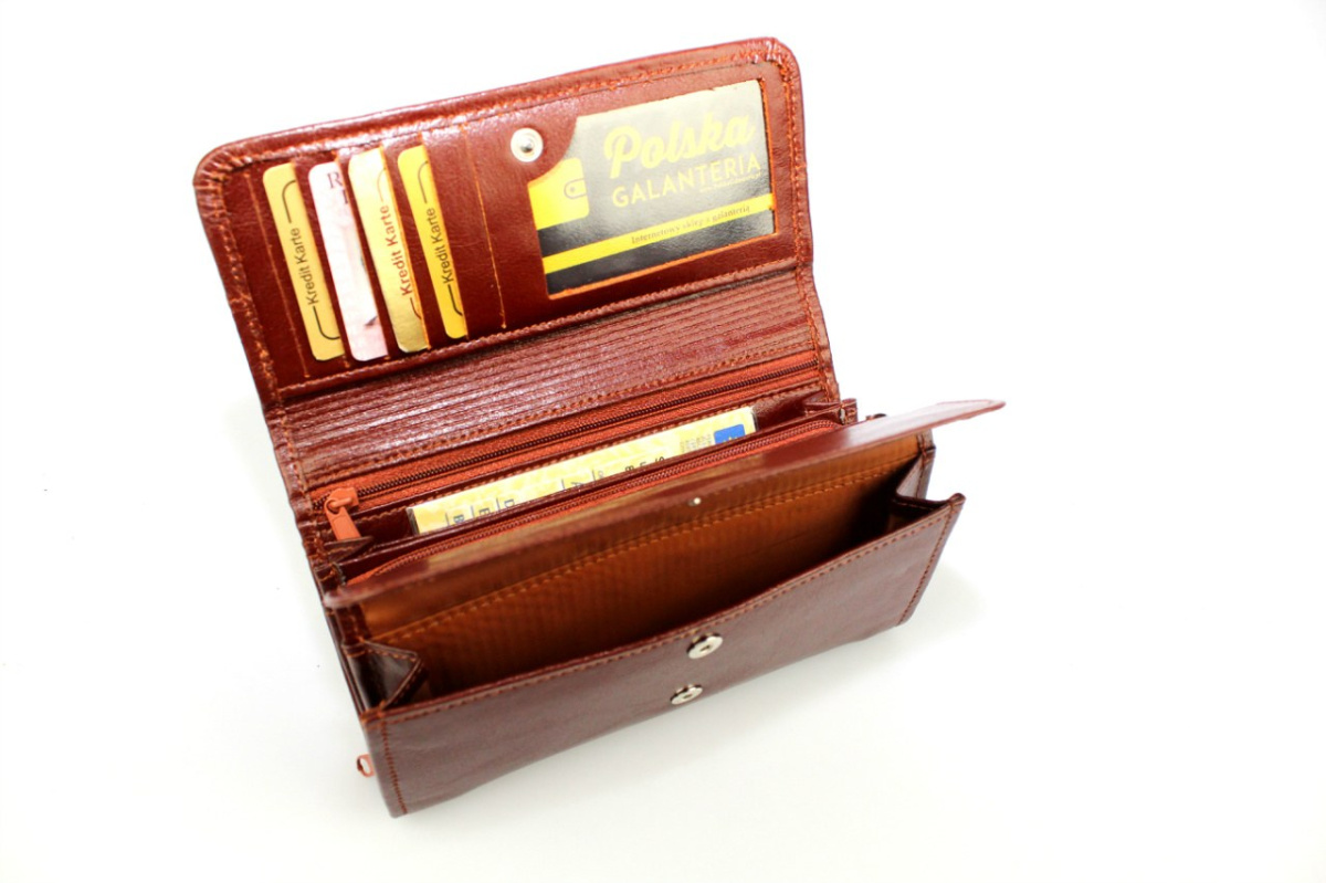 Oferowany na PolskaGalanteria portfel damski SARA swoim designem z pewnością spodoba się każdej zadbanej i nowoczesnej kobiecie. Cały portfel jest pokryty naturalną skórą licową, którą producent wykończył w kilku kolorach do wyboru. Gwarantuje to możliwość dopasowania koloru portfela do ulubionych stylizacji. Główne zamknięcie na zatrzask jest bardzo bezpieczne i dobrze chroni zawartość, w której można umieścić wiele kart i dokumentów. Z tyłu portfela znajduje się otwarta kieszeń dodatkowa, którą można użyć na przechowywanie często wyjmowanych rzeczy lub takich, które nie zmieszczą się wewnątrz. Bardzo wysoka jakość wykonania i nowoczesny wygląd tego portfela zwiastują przyjemne użytkowanie przez wiele lat.