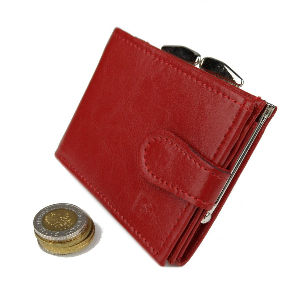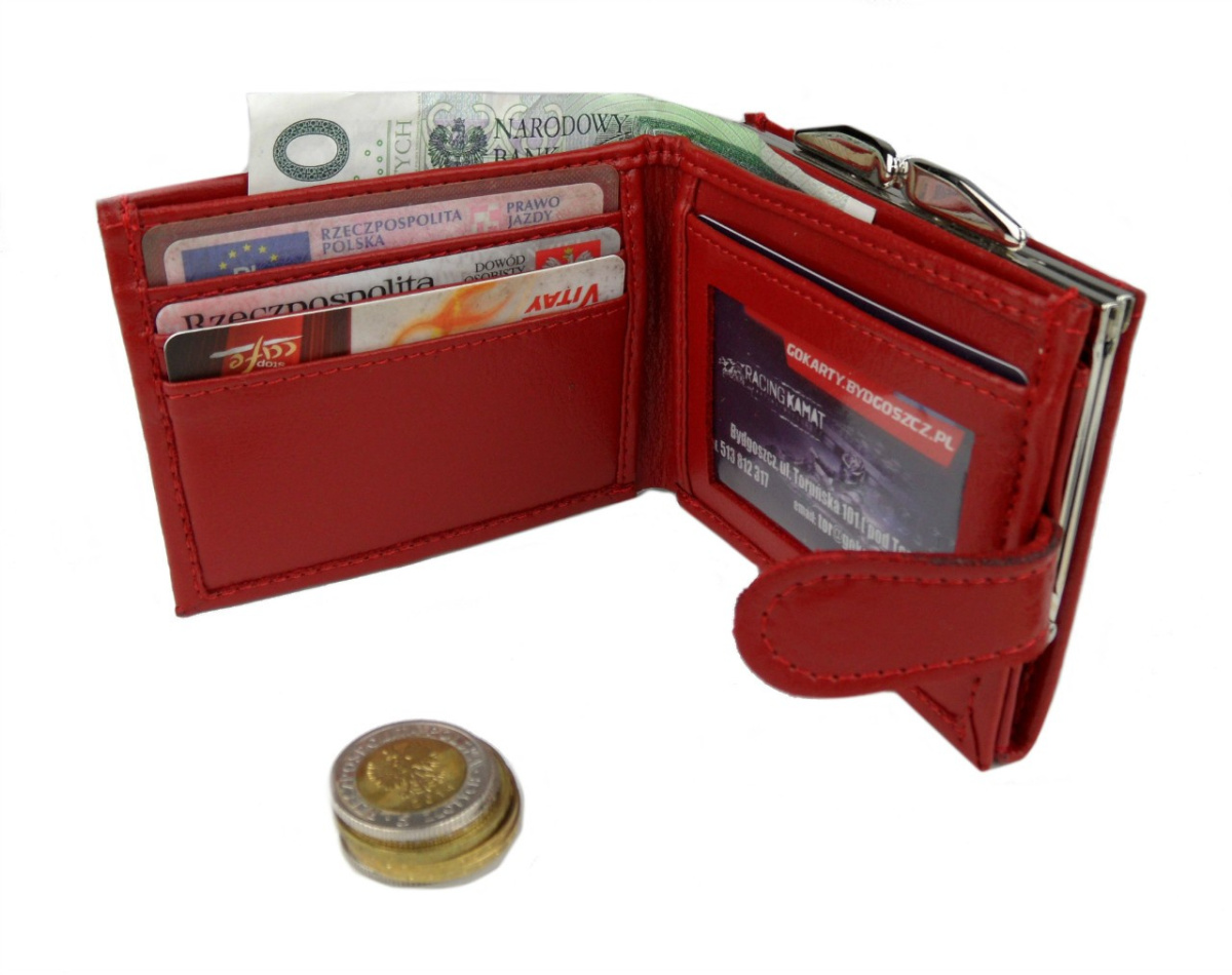 - duża praktyczna kieszeń na bilon, zapinana na klamrę bez prześwitów w dolnych rogach - co zapobiega gubieniu zawartości; kieszeń odchyla się na tyle daleko, że nie ma problemów z wyciąganiem bilonu