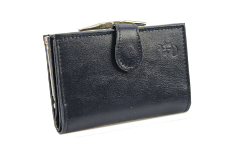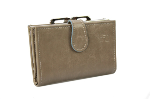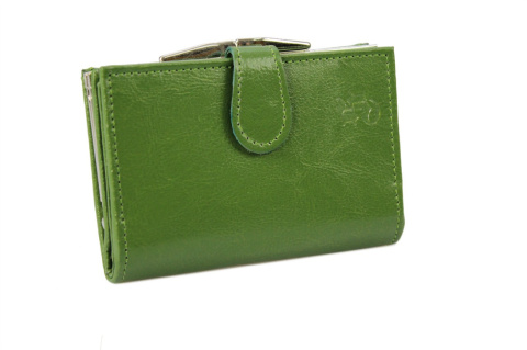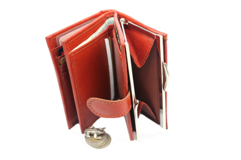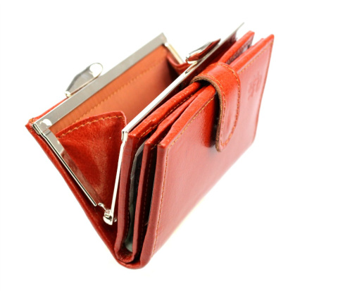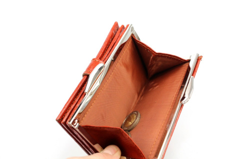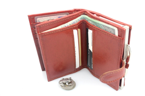 - Zewnętrzna duża praktyczna kieszeń na bilon, zapinana na klamrę bez prześwitów w dolnych rogach - co zapobiega gubieniu zawartości; kieszeń odchyla się na tyle daleko, że nie ma problemów z wyciąganiem bilonu