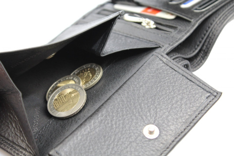 - Duża praktyczna kieszeń na bilon, zapinana na nap, bez prześwitów w dolnych rogach - co zapobiega gubieniu zawartości; kieszeń odchyla się na tyle daleko, że nie ma problemów z wyciąganiem bilonu,