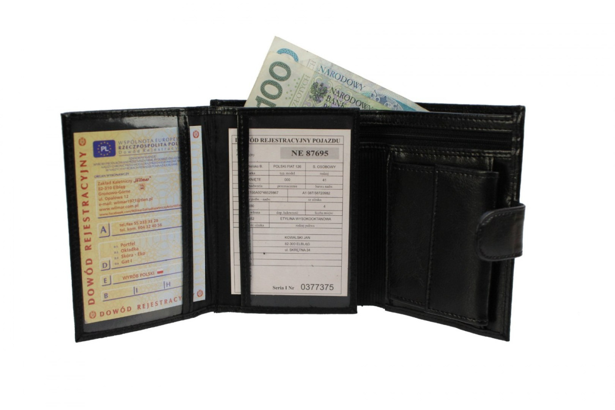 - Wewnątrz znajdują się dwa skrzydełka z miejscami na dokumenty: 7 miejsc na dokumenty formatu ID (karta płatnicza / kredytowa, d. osobisty itp.) + dwa przezroczyste miejsca na duże dokumenty typu d. rejestracyjny 12 x 7 [cm] wykończone folią,