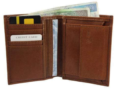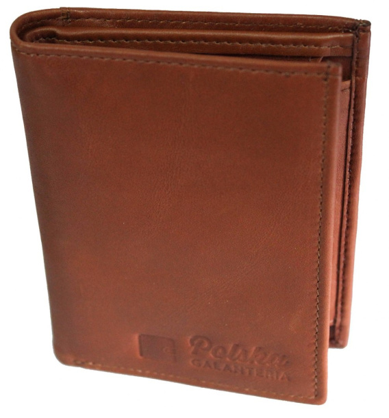Pionowyportfel męski PolskaGalanteria wykonany ze skóry cielęcej. Wyrób uszyto z najwyższą starannością, dbając zarówno o jakość użytych materiałów, jak i funkcjonalność oraz pojemność wnętrza. Brązowy portfel ma wewnątrz jedno skrzydełko oraz kieszenie i schowki, w których znajduje się miejsce nie tylko banknoty, ale i dokumenty w większym i mniejszym formacie. Bezpieczna kieszeń na bilon jest zamykana na solidną napę. Skóra użyta do wyrobu portfela jest wysokiej jakości skórą licową, pozyskiwaną z polskich garbarni, a podszewkę do wnętrza uszyto z mocnej i wytrzymałej tkaniny. Po rozłożeniu portfela kieszeń na banknoty uzyskuje rozmiary 18 x 12 cm, a pięć miejsc na dokumenty takie jak dowód osobisty czy karty płatnicze, ciasno przylegają, nie pozwalając na wysunięcie się przedmiotów. Wymiary całkowite portfela to: 13 x 10,5 cm.