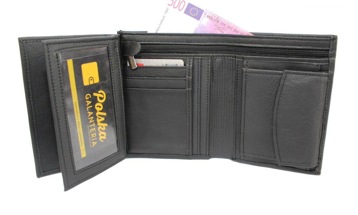Skórzane portfele dziś stały się jednymi z najbardziej pożądanych dodatków galanteryjnych. Kobiety uwielbiają torebki wykonane ze skóry, a mężczyźni bardzo cenią sobie portfele. Oferowany model przeznaczony jest dla Panów, którym zależy na bezpiecznym i funkcjonalnym przechowywaniu ważnych dokumentów i pieniędzy. Model został wykończony w czarnym kolorze, dzięki czemu jest bardzo uniwersalny i z pewnością każdemu mężczyźnie doda klasy i elegancji. Wewnątrz znajduje się miejsce wykończone folią z przeznaczeniem na dowód rejestracyjny, a praktyczna kieszeń na bilon zapinana na zatrzask doskonale zabezpiecza monety przed zgubieniem. Ten portfel męski SARA to również idealny pomysł na prezent.
