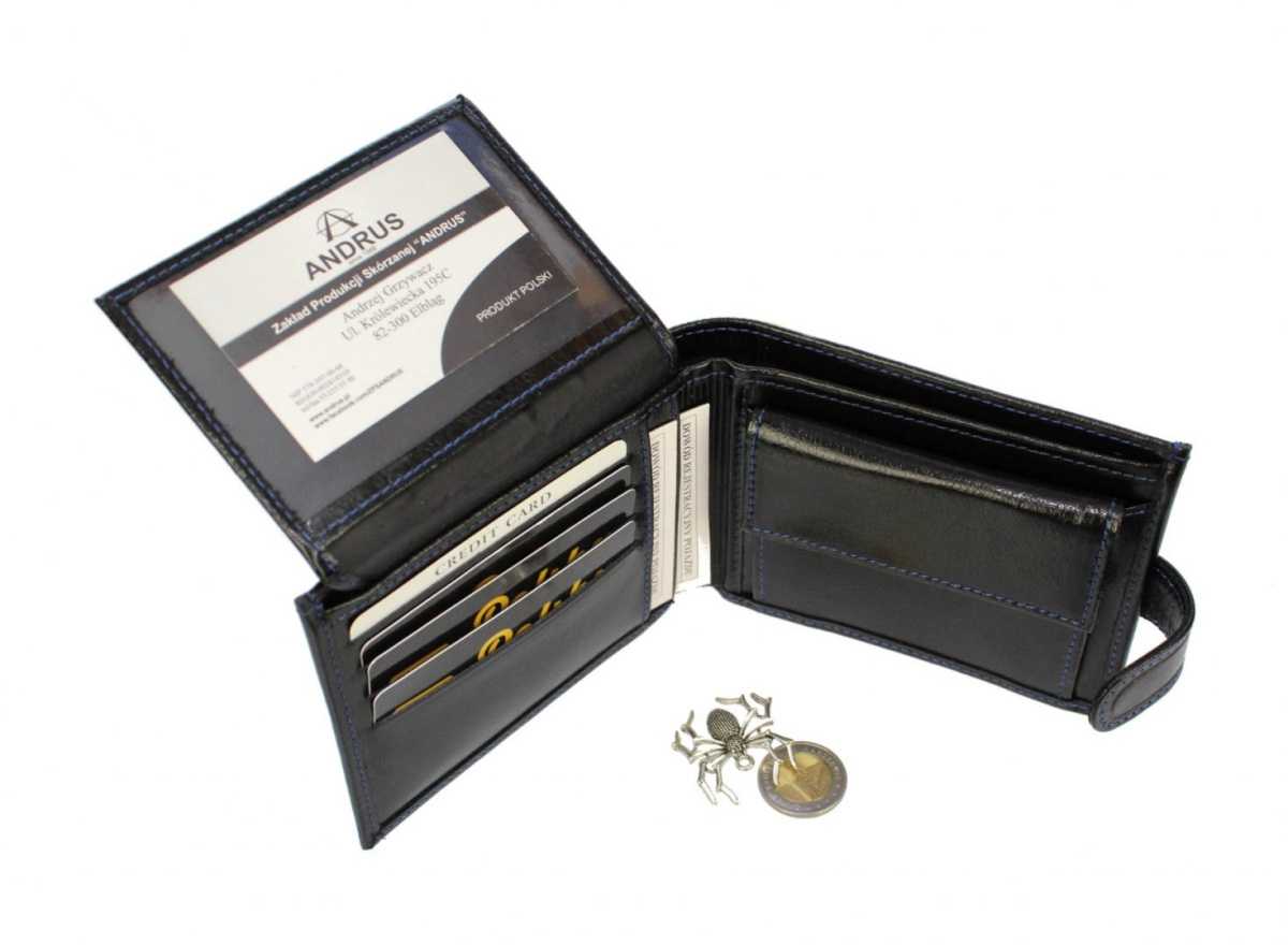 Portfel Męski Skórzany ANDRUS (PL) Skóra Licowa Duży Poziomy Z Zapięciem Jedno Skrzydełko Do Góry RIFD 13 x 10 x 2,5 [cm]