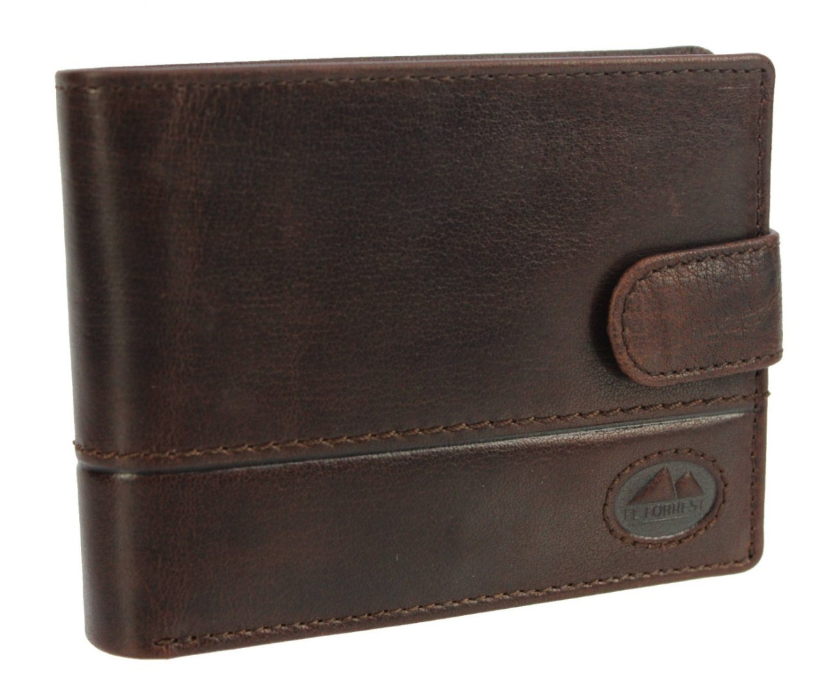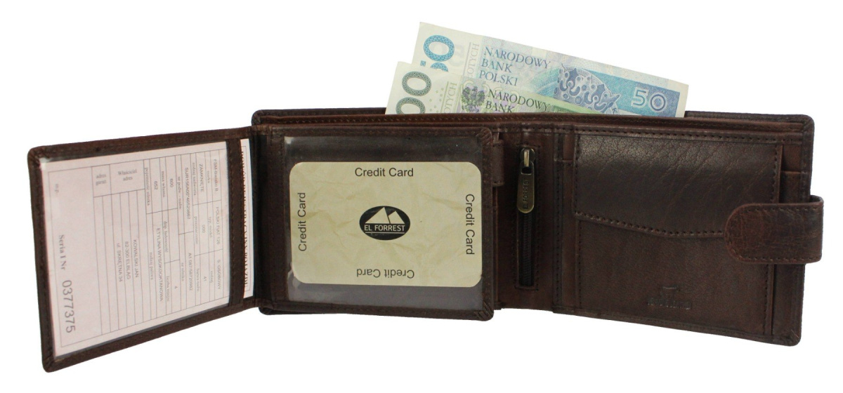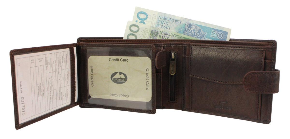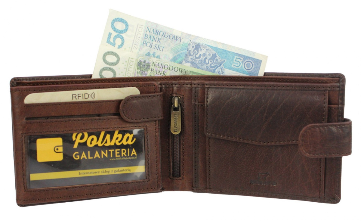 Portfel męski skórzany firmy El Forrest. Popularny model RFID 892 61 z zapinką jest lubiany przez klientów za swoją funkcjonalność i możliwości przechowywania wielu najpotrzebniejszych rzeczy. Wewnątrz portfela znajdują się praktycznie wykorzystane poziomy kieszeni na banknoty, dokumenty typu ID oraz karty, a także przezroczysty schowek na dokumenty w większym formacie, takie jak dowód rejestracyjny. Przegródka na bilon jest zapinana na napę, a jej dolna część nie ma prześwitów, przez co monety nie wypadają po otwarciu portfela. Klasyczna stylistyka produktu, użycie wysokiej jakości naturalnej skóry bydlęcej oraz solidne i efektowne wykonanie sprawia, że portfel ucieszy każdego pana i będzie mu służyć przez długie lata. Produkt można zapakować w firmowe pudełko, tworząc gotowy do wręczenie prezent.