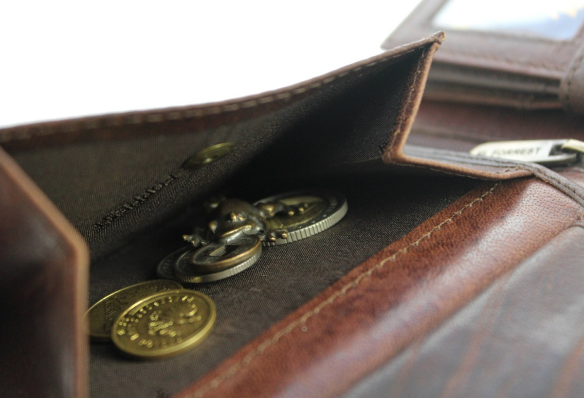 - Duża praktyczna kieszeń na bilon, zapinana na nap, bez prześwitów w dolnych rogach - co zapobiega gubieniu zawartości; kieszeń odchyla się na tyle daleko, że nie ma problemów z wyciąganiem bilonu.
