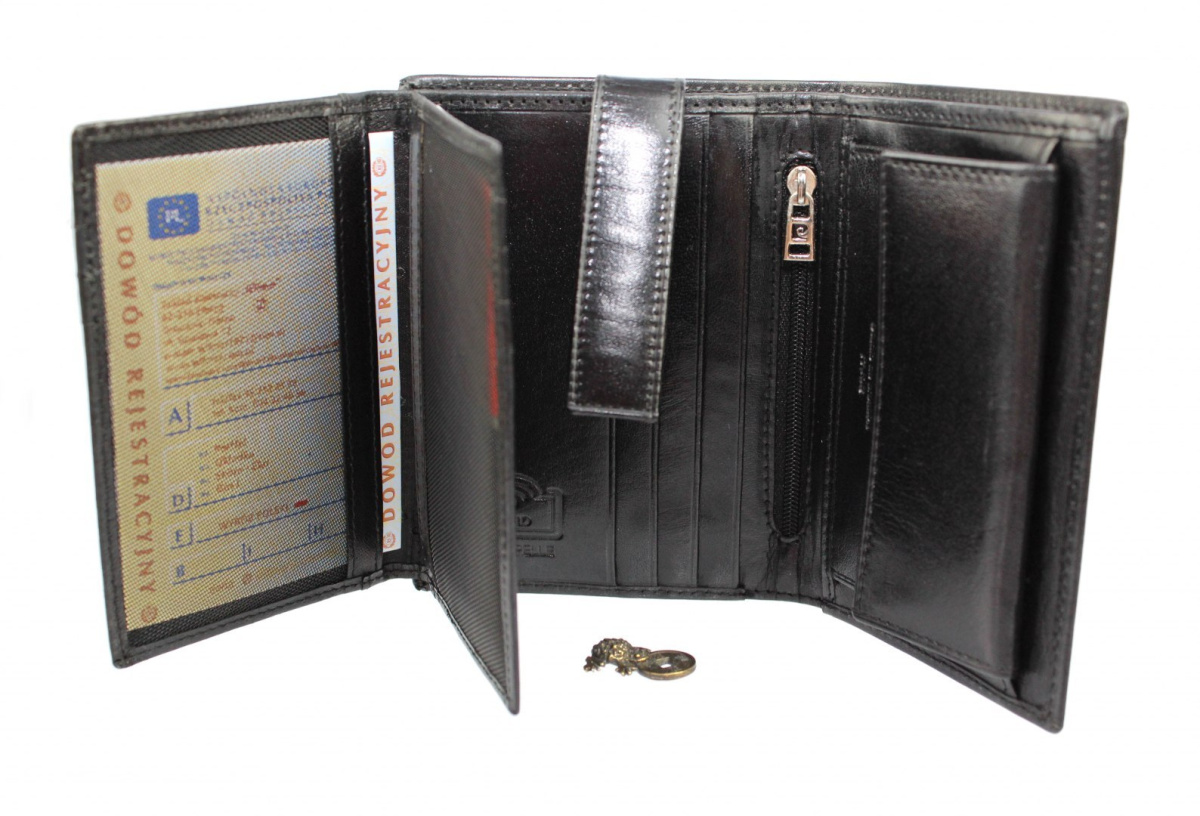 - Wewnątrz znajduje się następna zapinka, która zamyka dwa skrzydełka z miejscami na dokumenty: 9 miejsc na dokumenty formatu ID (karta płatnicza / kredytowa, d. osobisty itp.) + dwa przezroczyste miejsca na duże dokumenty typu d. rejestracyjny 10,5 x 7 [cm] wykończone jasną, wytrzymałą siateczką a nie folią,