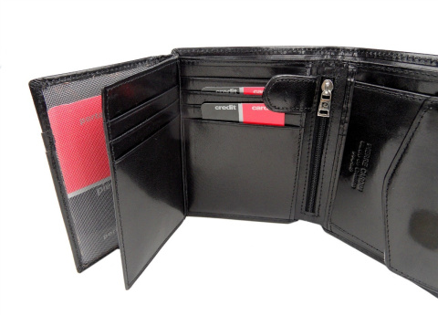 Klasyczny i elegancki model portfela od marki Pierre Cardin, wyprodukowany z bardzo dobrej jakości oraz miękkiej skóry naturalnej, lekko błyszczącej ale gładkiej. Od zewnętrznej strony ozdobiony wytłaczanym logiem producenta oraz ozdobną blaszką. Nie jest zapinany, sposób otwierania jest taki sam jak książki. W środku znajdują się skrzydełka, z dziewięcioma przegródkami na przykład na dowód osobisty czy karty płatnicze, a także dwie większe przegródki, przezroczyste na przykład na dowód rejestracyjny. Portfel ten posiada również podwójną kieszeń na banknoty, jedną zapinaną na zatrzask kieszeń na monety, która dość szeroko się otwiera co ułatwia wyjęcie monet, oraz jedną kieszonkę zapinaną na metalowy suwak. Dzięki swym klasycznym wymiarom portfel ten, może być noszony swobodnie w kieszeni.