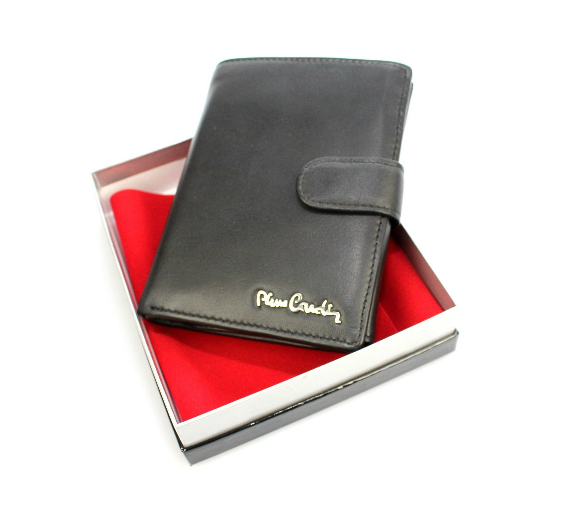 Męski portfel wykonany z miękkiej, naturalnej skóry przez cenionę markę Pierre Cardin. Występuje w dwóch wariantach kolorystycznych brązowym oraz czarnym. Portfel rozkłada się w stylu książkowym, zapinany jest na zewnętrzną napę. W środku znajduje się kolejne zapięcie, która zapina dwa skrzydełka z kieszeniami na dokumenty wielkości dowodu osobistego, a także dwa przezroczyste miejsce wykończone przezroczystą siateczką na większę dokumenty typu dowód rejestracyjny. Posiada kieszeń na bilon, zapinaną na zatrzask, podwójną kieszeń na banknoty oraz schowek zapinany na suwak z elegancką końcówką. Podszewka w portfelu również jest wykonana z wysokiej jakości materiału, z logiem producenta. Portfel posiada bardzo estetyczne pudełko, w które jest pakowane, dzięki czemu portfel może stać się bardzo eleganckim prezentem.