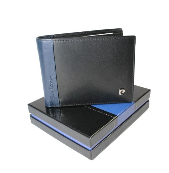Portfel Męski Skórzany PIERRE CARDIN Skóra Licowa Duży Poziomy Bez Zapięcia CZARNY Z Niebieskim Paskiem 8806