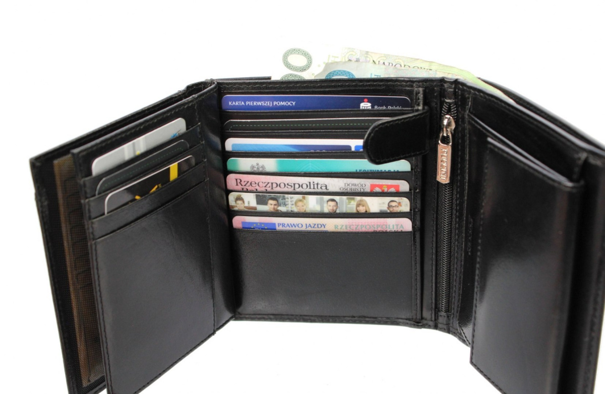 - Portfel przeznaczony jest dla osób które posiadają bardzo dużo kart, nasz wspaniały portfel pomieści ich aż 11, dodatkowo pod miejscami na karty znajduje się schowek w który możemy umieścić np. dowód rejestracyjny