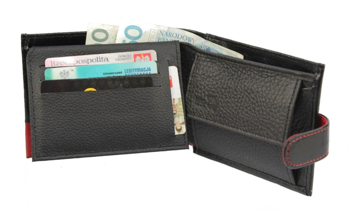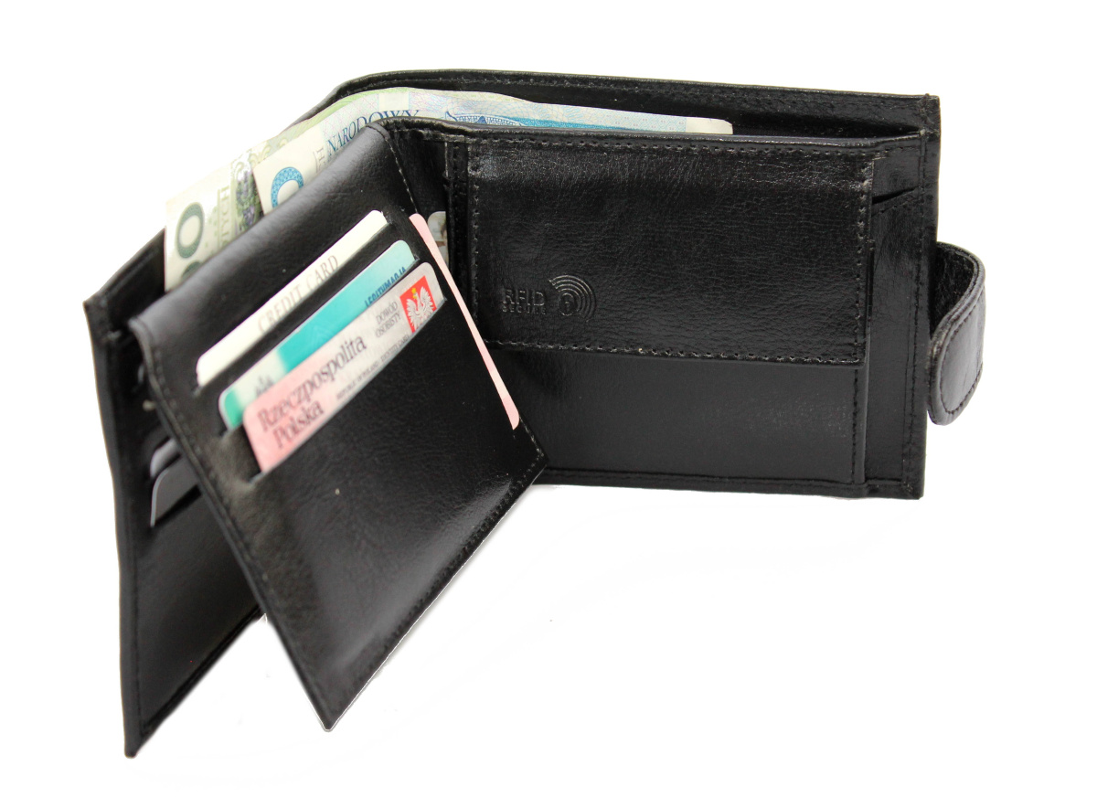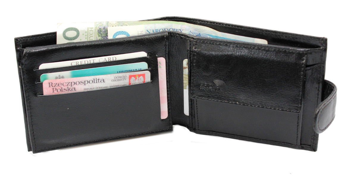 - Portfel posiada zabezpieczenie RFID (uniemożliwia zeskanowanie kart płatniczych)